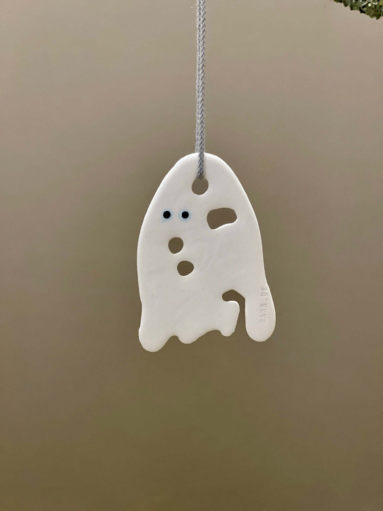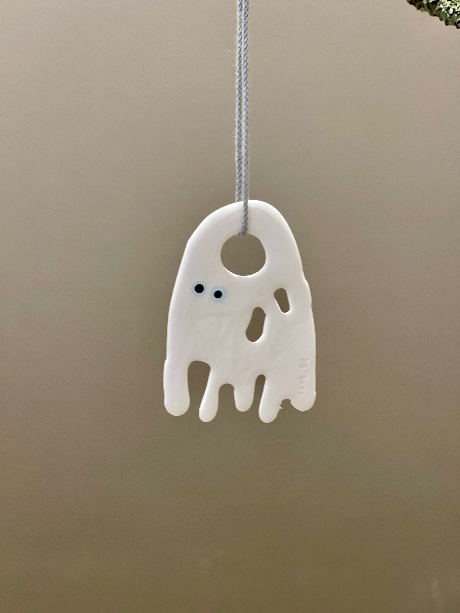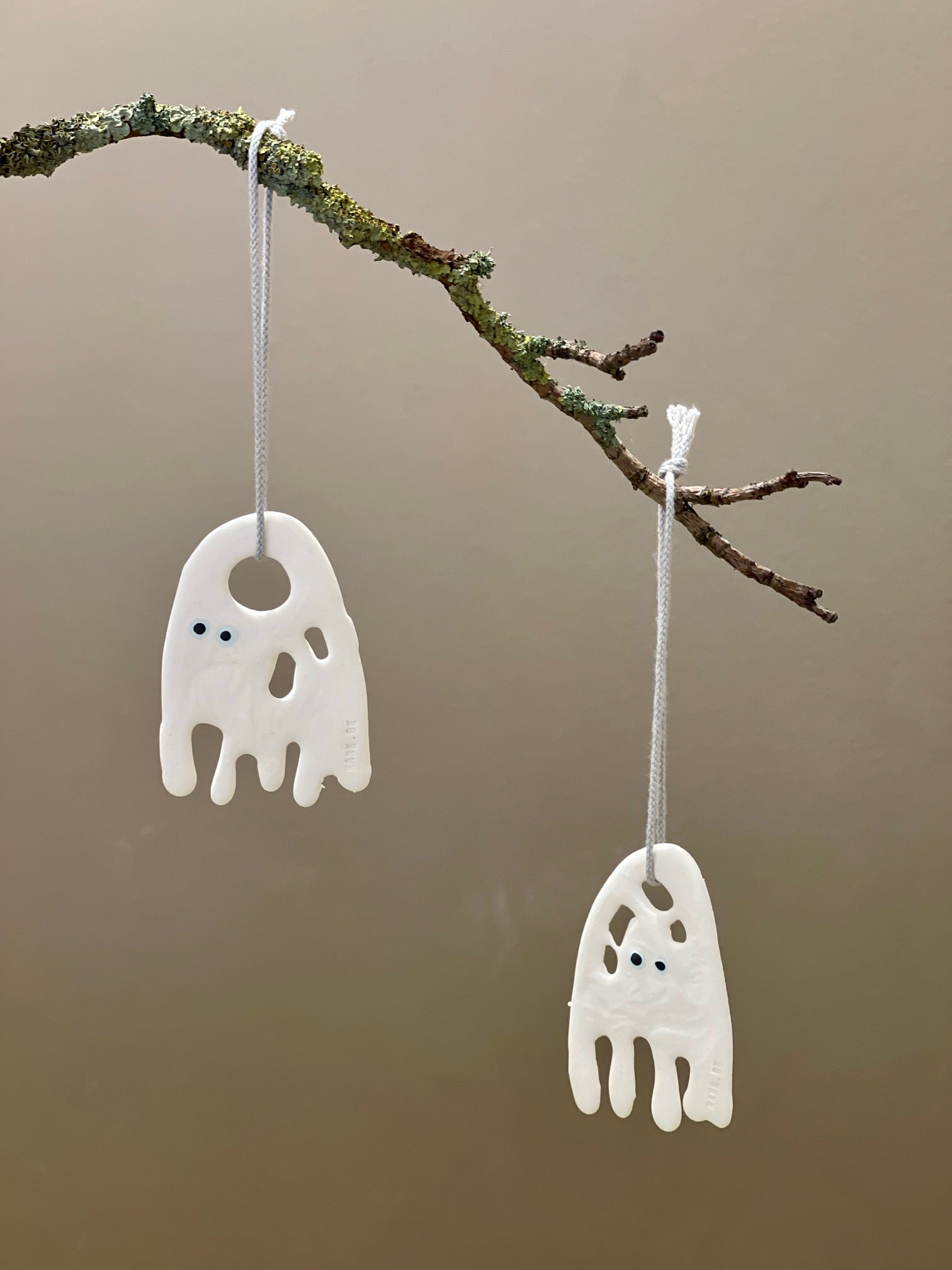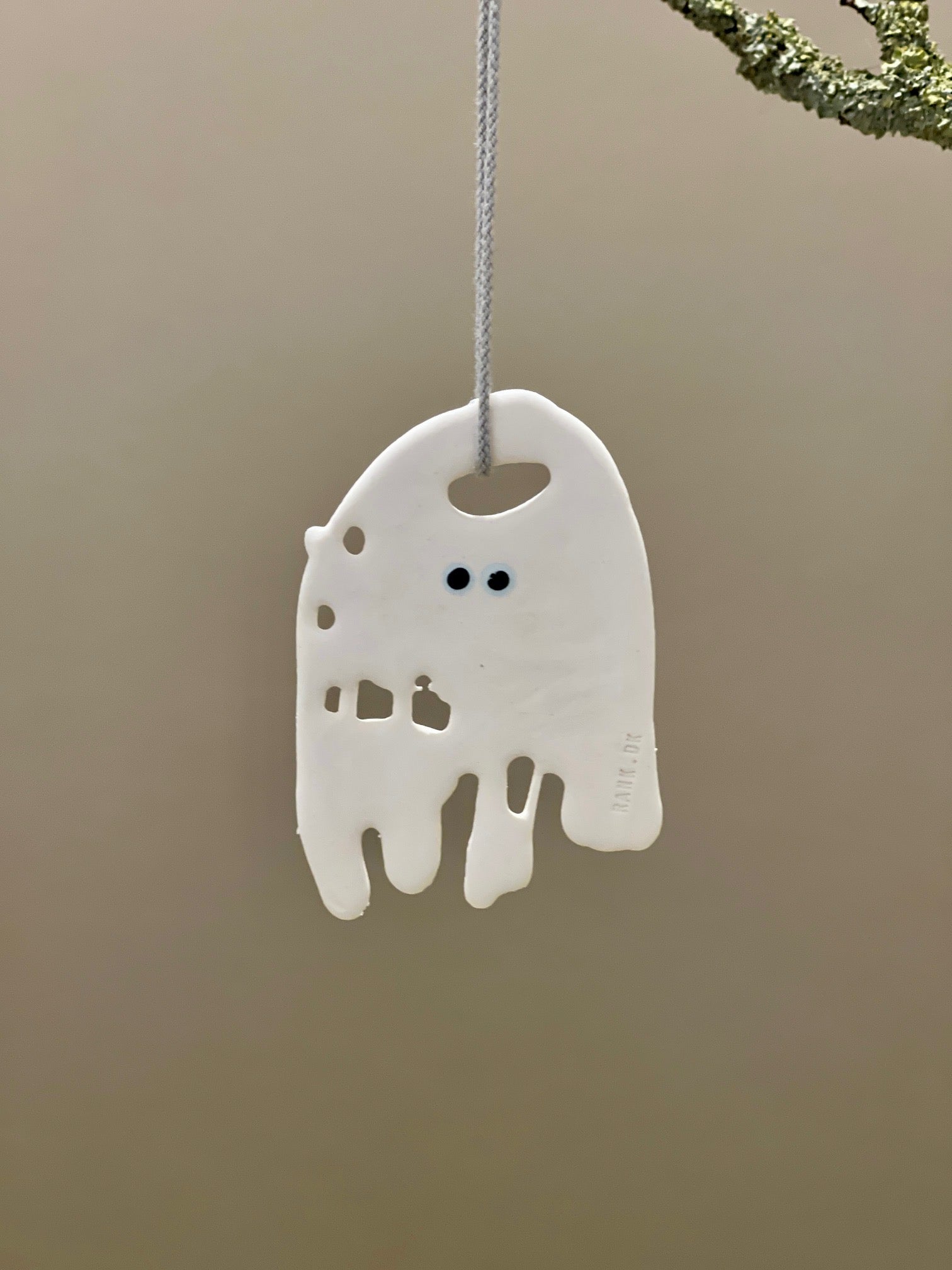 5 spøgelser i delikat porcelæn med tilhørende snor i matchende farver, pakket i en lækker gaveæske af naturbrun karton. Spøgelserne er hvide med lyseblå og sorte øjne. Højden på et spøgelse kan variere mellem 6 og 9 cm.